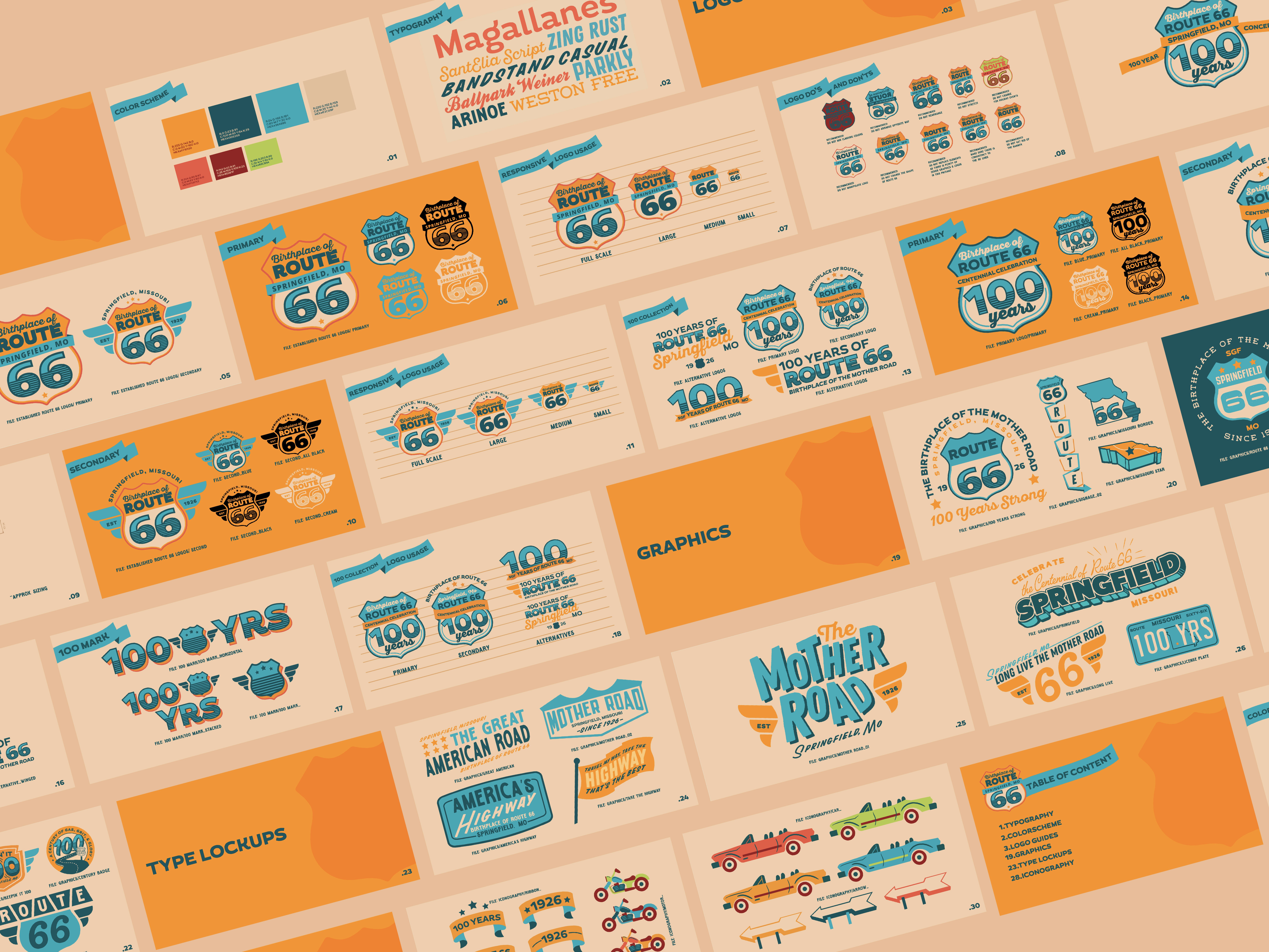 How do you brand a road that brands itself? Route 66 already carries a ton of baggage—classic cars, diners, motels, the whole road-trip playlist. Add in an existing logo system and the project becomes a balancing act: respect the heritage, keep the recognition, but add enough kick to feel like the official centennial mark. It couldn’t look like a government patch job. It had to look like a party you didn’t want to miss.